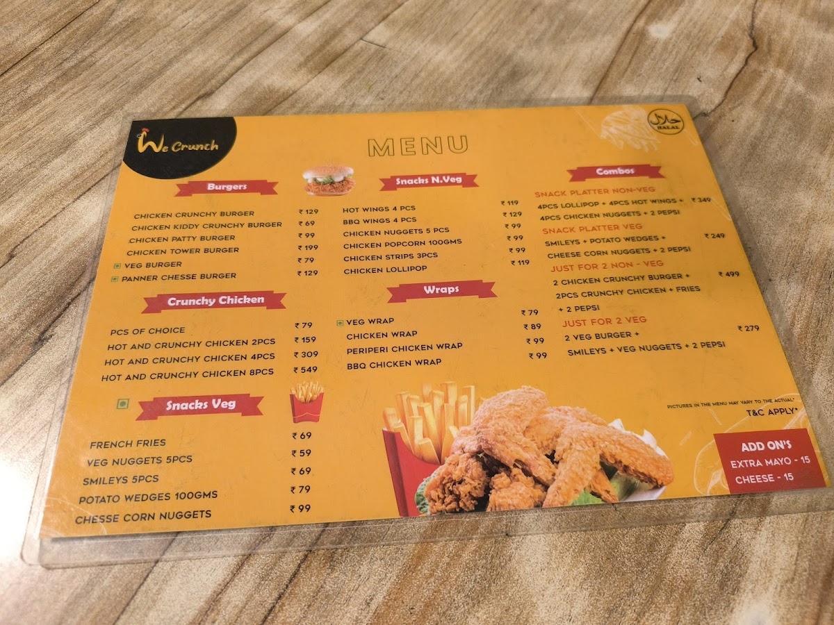 We Crunch Jalahalli is a vibrant café nestled in the heart of Jalahalli, Bengaluru. This culinary haven offers a delightful menu that combines comfort food with a fun, engaging atmosphere. Guests are greeted with an impressive selection of crunchy chicken, served in various portions—perfect for sharing or indulging solo. Options start at just ₹89 for a piece or go up to ₹699 for 8 pieces of hot and crispy goodness.